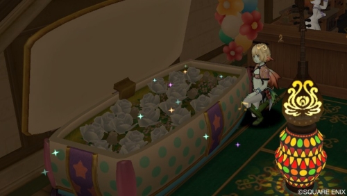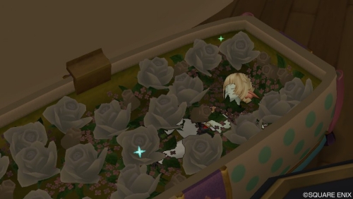 白いお花の詰まったみずたまの棺桶風ベッドを頂いてきましたよ。